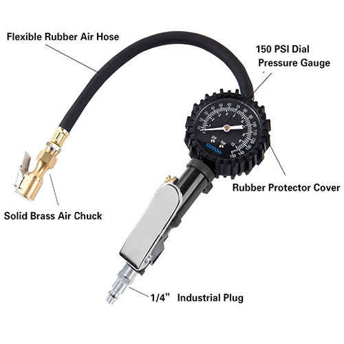 YOTOO Tire Inflator with Pressure Gauge makes filling tires extremely easy when using an air compressor. It is widely applied to car, suv, truck, motorcyle, bicycle (with schrader valve or presta valve), even sports balls (with ball needle) etc. This tire inlator gauge features high accuracy tire gauge which with in-the-dark dial display screen for easy reading, even works by night use. Gauge head is guarded by our rugged rubber protective cover. The ecgronic triger is easy to use. This tire inflator with gauge, air chuck, air hose and blead valve for test pressure, inflation tire and depressing air. It includes 1/4" indusrtial plug to connect air compressor, and the 90 degree valve extender allows to connect hard-to-reach tire valve insides car tire. Perfectly work with different stem clamps! Also includes presta valve adapter allows to inflate a tire with presta valve. Perfectly work for tires with schrader valve or presta valve. We promised FREE 100% Lifetime Satisfaction Guarantee when you order today, so click "Add to Cart" with confidence. Any problem, please feel free to contact us.